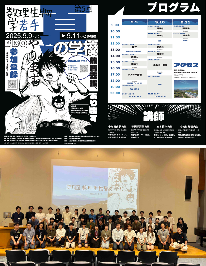 2025年9月9日から11日にかけて総合研究大学院大学葉山キャンパスにて、「第5回数理生物学夏の学校」を開催した。本会は、数理生物学分野に関心の高い有志の若手研究者により企画され、多様な分野における基礎理論の学習機会、参加者同士の交流、新たな共同研究の開拓を目的としており、過去4回の開催実績がある。 今年度の第5回では、参加者は過去最多の50名を超え、その約6割は学部生・修士学生であり、若手研究者にとって基礎理論の習得と研究交流の双方を得られる貴重な機会となった。4名の先生方をお招きし、進化生態学、医療AI、最適輸送理論、進化ゲーム理論に関する講義を実施した。各講義では基礎から応用研究まで幅広い内容が扱われ、活発な討論が行われた。 また、42名によるポスター発表を行い、最優秀賞3名・優秀賞3名を表彰した。ポスターは期間中掲示し、夜間も含め自由かつ活発な議論が続いた。事後アンケートでは95%が「また参加したい」と回答し、参加者の83%が交流の促進を実感する結果となり、会の目的である研究者間の交流促進という目標を達成することができた。